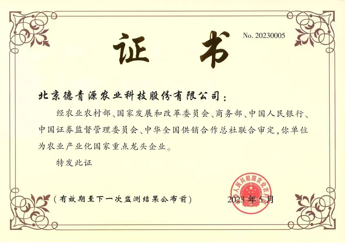 近日,經(jīng)農(nóng)業(yè)農(nóng)村部、國家發(fā)展和改革委員會、商務(wù)部、中國人民銀行、中國證券監(jiān)督管理委員會、中華全國供銷合作總社聯(lián)合審定,北京德青源農(nóng)業(yè)科技股份有限公司再次被認(rèn)定為農(nóng)業(yè)產(chǎn)業(yè)化國家重點龍頭企業(yè)。這是自2007年起,德青源第8次獲得此項殊榮。
